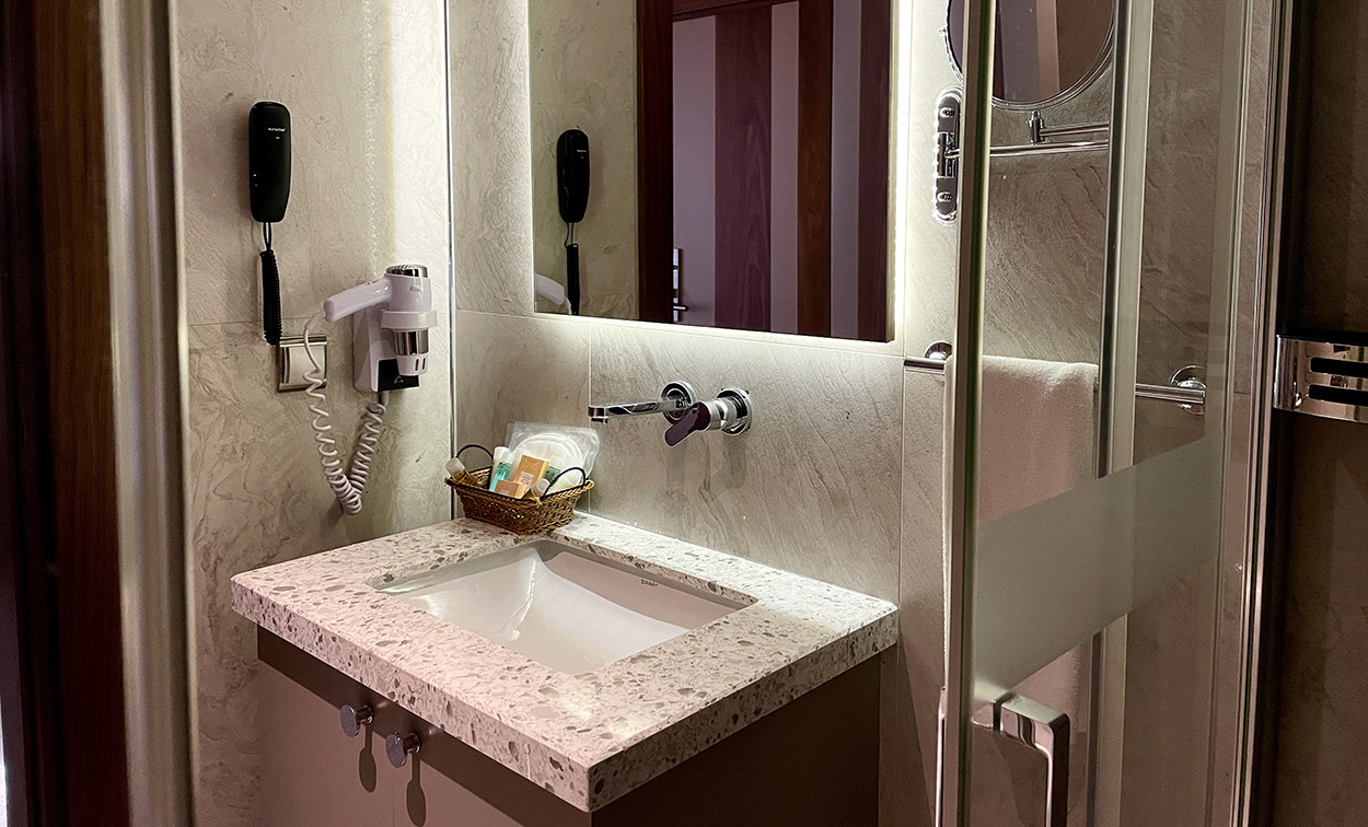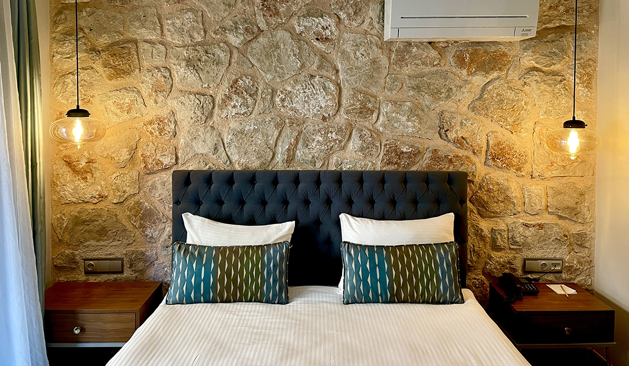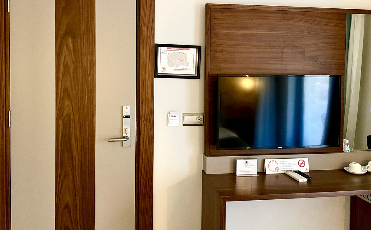 Standard room, located on the garden floor, has a view of the inner garden. Standard room is 15 square meters. In our standard room, as in all our rooms, there is a balcony, double bed, smart LED TV, air conditioning, make-up table, safe box, water heater, welcome tray, telephone and mini bar. All of our bathrooms have hair dryers, toiletries, large and small towels. Baby cots and extra beds are not available in our Stadard room. There is one Standard room in our hotel.