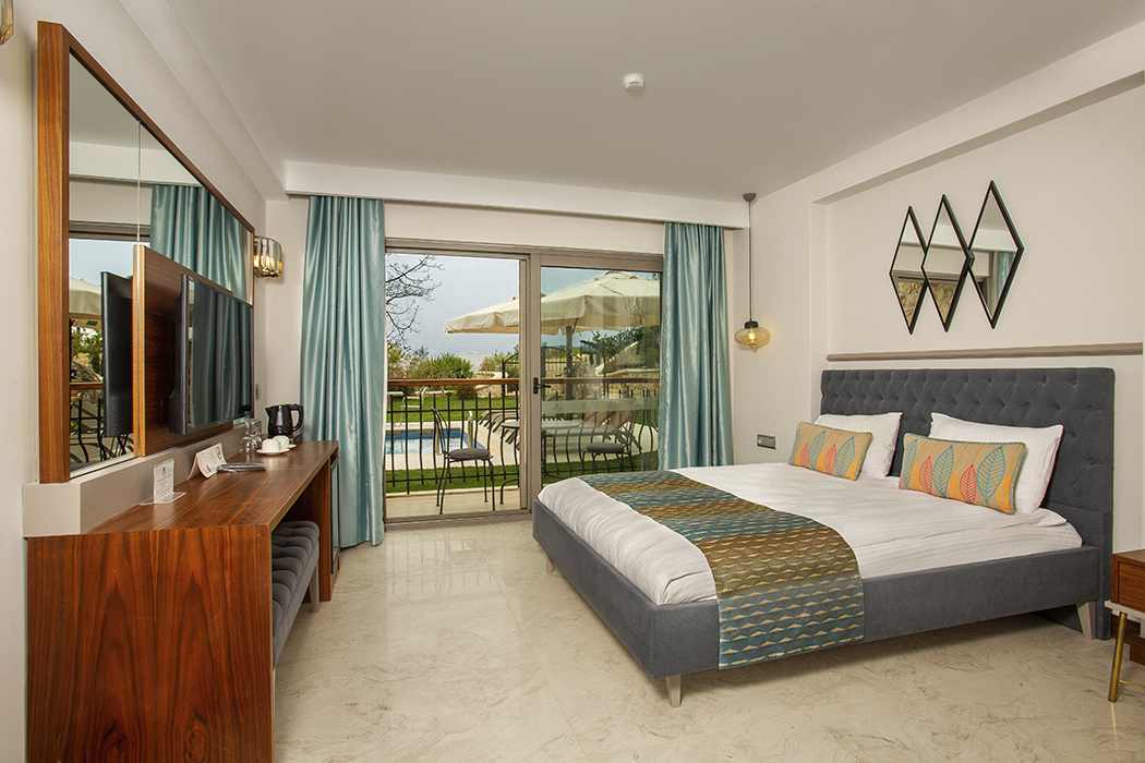 Junior rooms, located on the garden floor, have garden and pool views. Junior rooms are 22 square meters. In junior rooms, as in all our rooms, there is a balcony, double bed, smart LED television, air conditioning, make-up table, safe box, water heater, welcome tray, telephone and mini bar. All of our bathrooms have hair dryers, toiletries, large and small towels. In our junior rooms, baby bed and extra bed can be placed free of charge. There are four Junior rooms in our hotel.