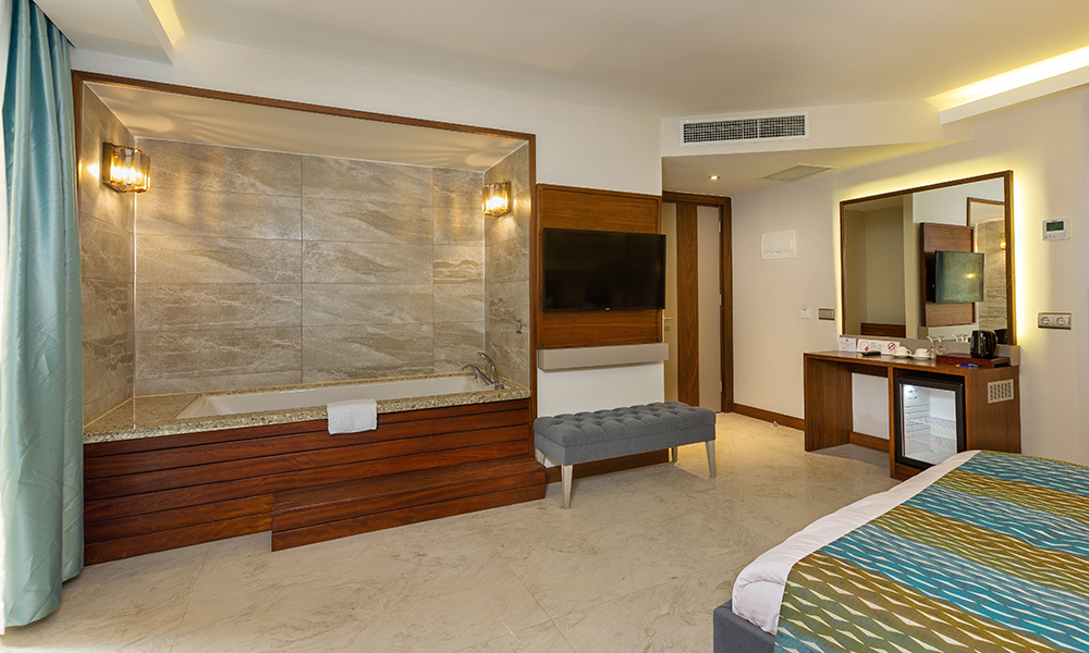 Comfort room, located on the garden floor, has a view of the inner courtyard. Comfort room is 24 square meters. Comfort room has a jacuzzi and a large balcony. In comfort room, as in all our rooms, there is a double bed, smart LED television, air conditioning, make-up table, safe box, water heater, welcome tray, telephone and mini bar. All of our bathrooms have hair dryers, toiletries, large and small towels. A baby bed and extra bed can be placed in our comfort room free of charge. There is one Comfort room in our hotel.