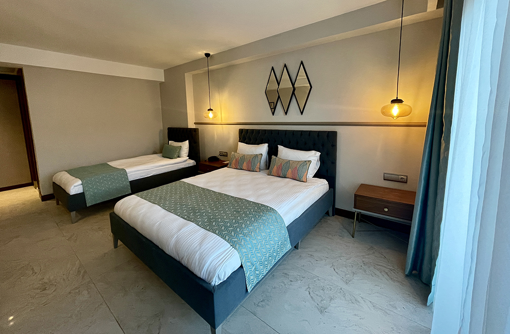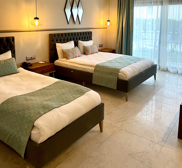 Family room, located on the garden floor, has garden and pool views. Family room is 28 square meters. Family room with pool view has one double bed and one single bed. In our family room, as in all our rooms, there is a balcony, smart LED television, air conditioning, make-up table, safe box, water heater, welcome tray, telephone and mini bar. All of our bathrooms have hair dryers, toiletries, large and small towels. A baby bed and extra bed can be placed in our Famile room with pool view free of charge. There is one Family room with pool view in our hotel.