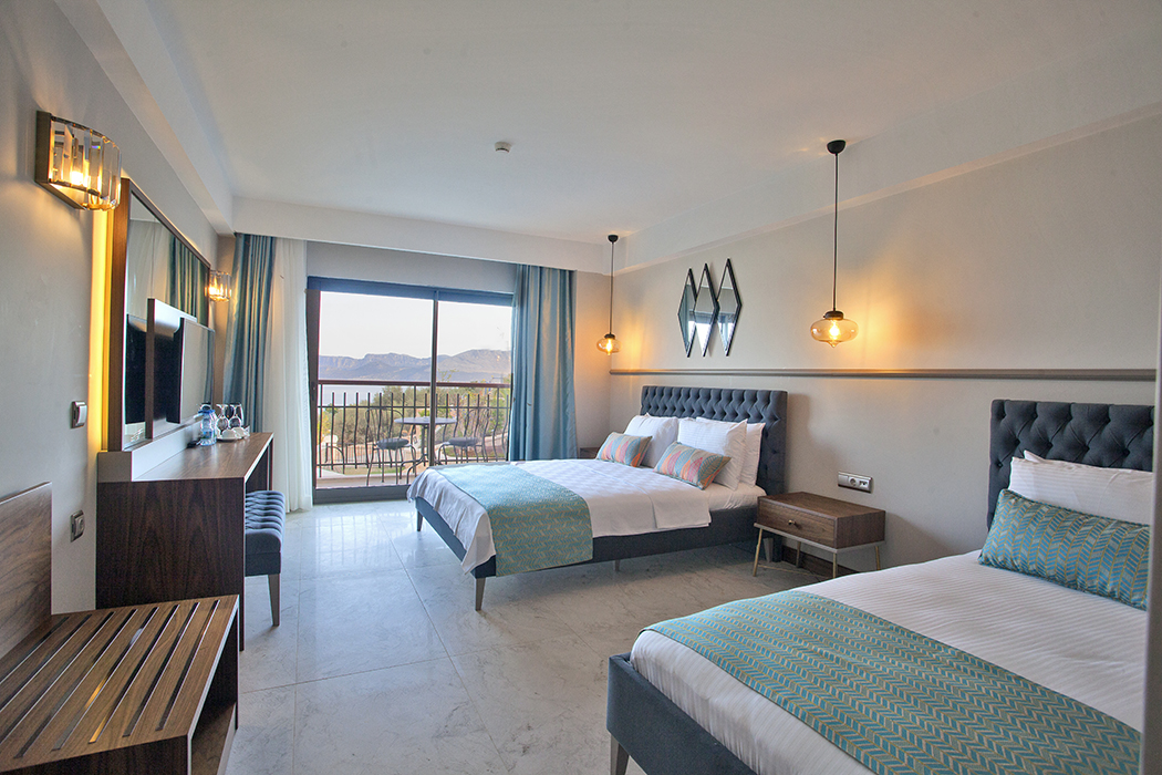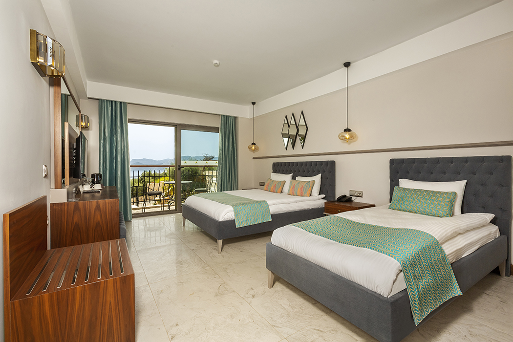 Family rooms on the first and second floors have sea views. Family rooms are 28 square meters. Family rooms with sea view have one double bed and one single bed. In our family rooms, as in all our rooms, there is a balcony, smart LED television, air conditioning, make-up table, safe box, water heater, welcome tray, telephone and mini bar. All of our bathrooms have hair dryers, toiletries, large and small towels. In our Famile rooms with sea view, baby bed and extra bed can be placed free of charge. There are two family rooms with sea view in our hotel.